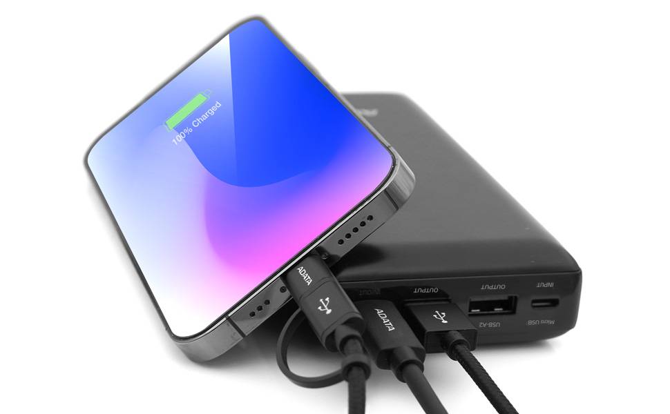 PowerBank ADATA C20 de 20,000 mAh. Carga simultánea 3 dispositivos. Con indicador LED de carga, dos puertos USB-A y un puerto USB-C. NEGRO. PBC20-BK